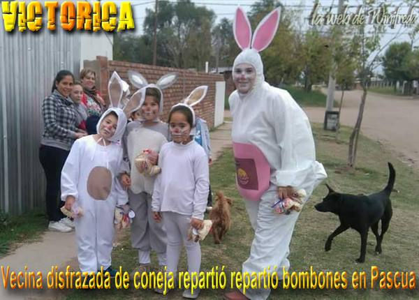 Durante la celebración de la Pascua, una mujer disfrazada de coneja y varios niños de conejitos repartieron 653 bolsas con bombones en los barrios donde residen y después continuaron la tarea en viviendas humildes de otras barriadas, en el Hogar de Ancianos y en la Escuela especial 9.