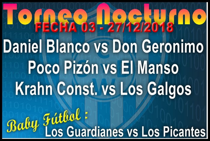 Hoy, jueves 27 de diciembre se disputará la tercera fecha del Torneo Nocturno "Ruso Ostapchuk" organizado por la Comisión Directiva del Club Social y Deportivo Winifreda, con tres partidos que se disputarán en uno de los campos de juego del Estadio "Dr. Miguel E. Baldovino" de nuestra localidad.
