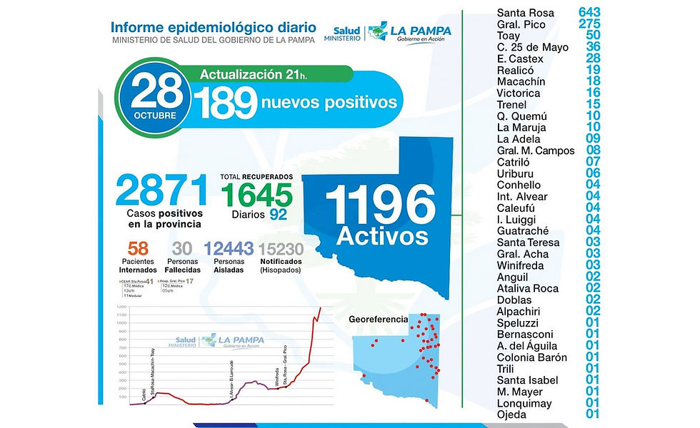 El Gobierno de la provincia de La Pampa, a través del Ministerio de Salud, comunicó que en horas de la tarde del día 28 de octubre concluyó el procesamiento de 446 muestras en los laboratorios de la Dirección de Epidemiología y del Establecimiento Asistencial Gobernador Centeno y Lucio Molas, de las cuales 189 resultaron positivas para COVID-19. De ellas, 90 pertenecen a personas residentes en Santa Rosa, 37 en General Pico,13 en Toay, 9 en Eduardo Castex, 10 en 25 de Mayo, 7 en Victorica, 7 en Macachín, 5 en La Maruja, 3 en Catriló, 2 en Guatraché, 2 en Alpachiri, 2 en Campos, 1 en Ojeda, 1 en La Adela.
