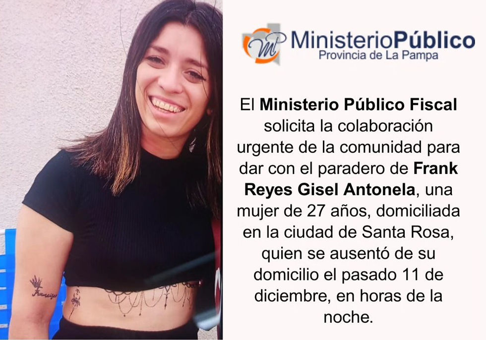 El Ministerio Público Fiscal de la Provincia de La Pampa solicita la colaboración urgente de la comunidad para dar con el paradero de Frank Reyes Gisel Antonela, una mujer de 27 años, domiciliada en la ciudad de Santa Rosa, quien se ausentó de su domicilio el pasado 11 de diciembre, en horas de la noche.