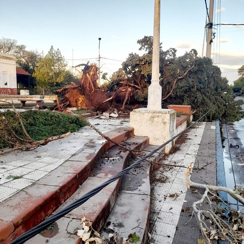 En la calle Olascoaga, tres árboles de gran porte aplastaron y derribaron el tapial del Prado Español. En tanto, en el predio del Colegio Clemente Andrada, dos pinos fueron arrancados de raíz y terminaron sobre la avenida San Martín Oeste, interrumpiendo el tránsito y generando riesgo para automovilistas.