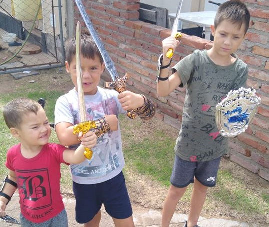 Acompañó su mensaje virtual con una foto de sus hijos menores posando con espadas de juguetes en sus manos preparados para darle batalla al enemigo invisible que nos acecha.